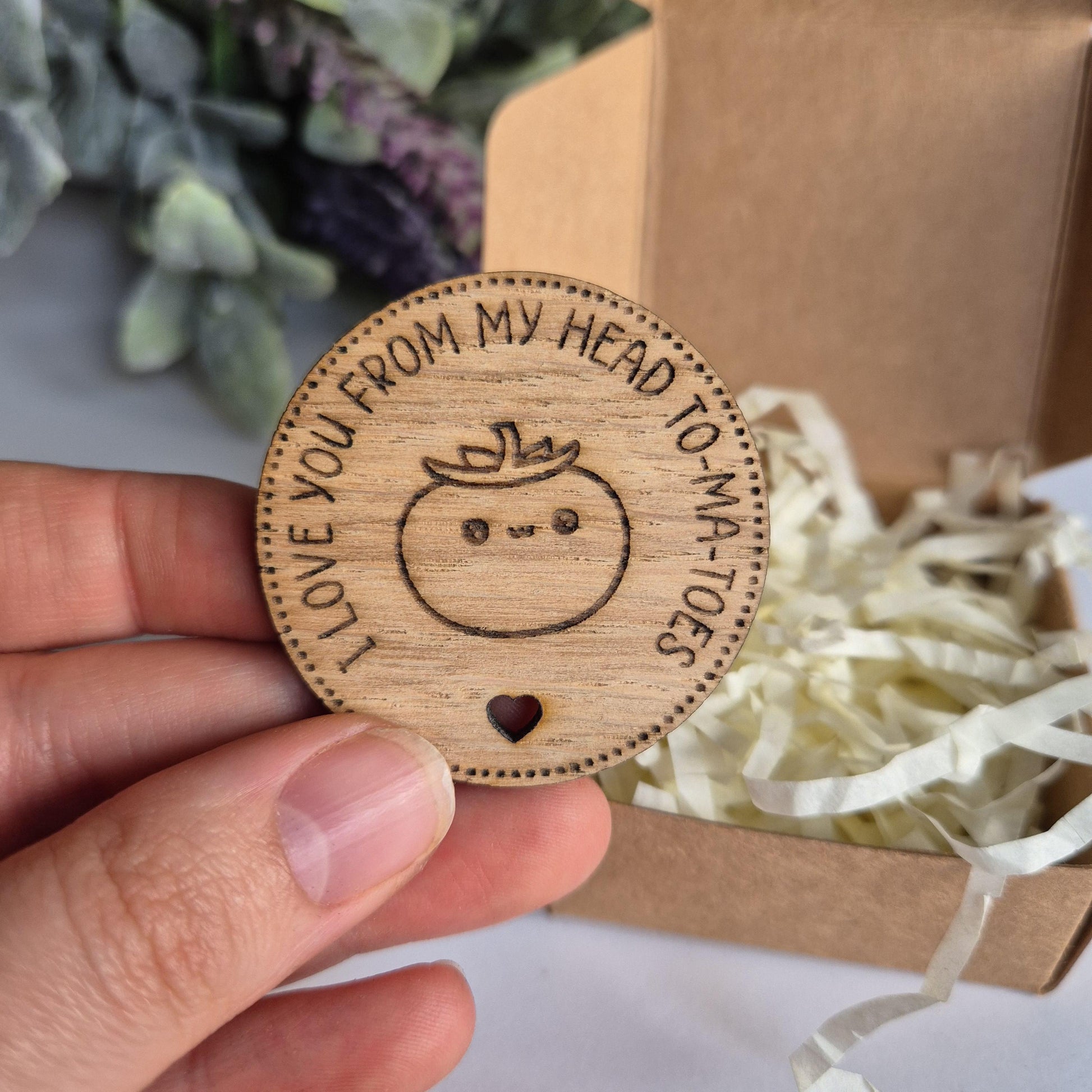 The wooden engraved token comes perfectly presented in a square brown box with shredded tissue paper, ready for gifting!